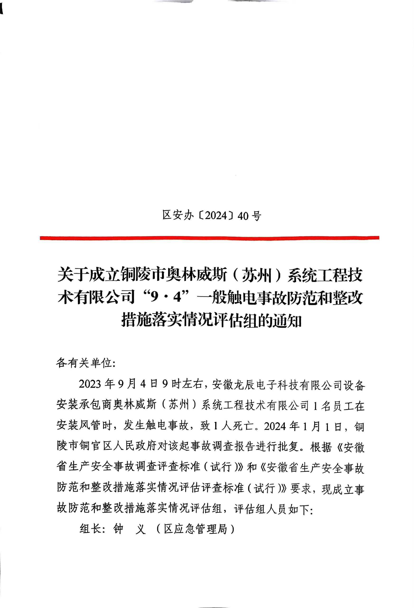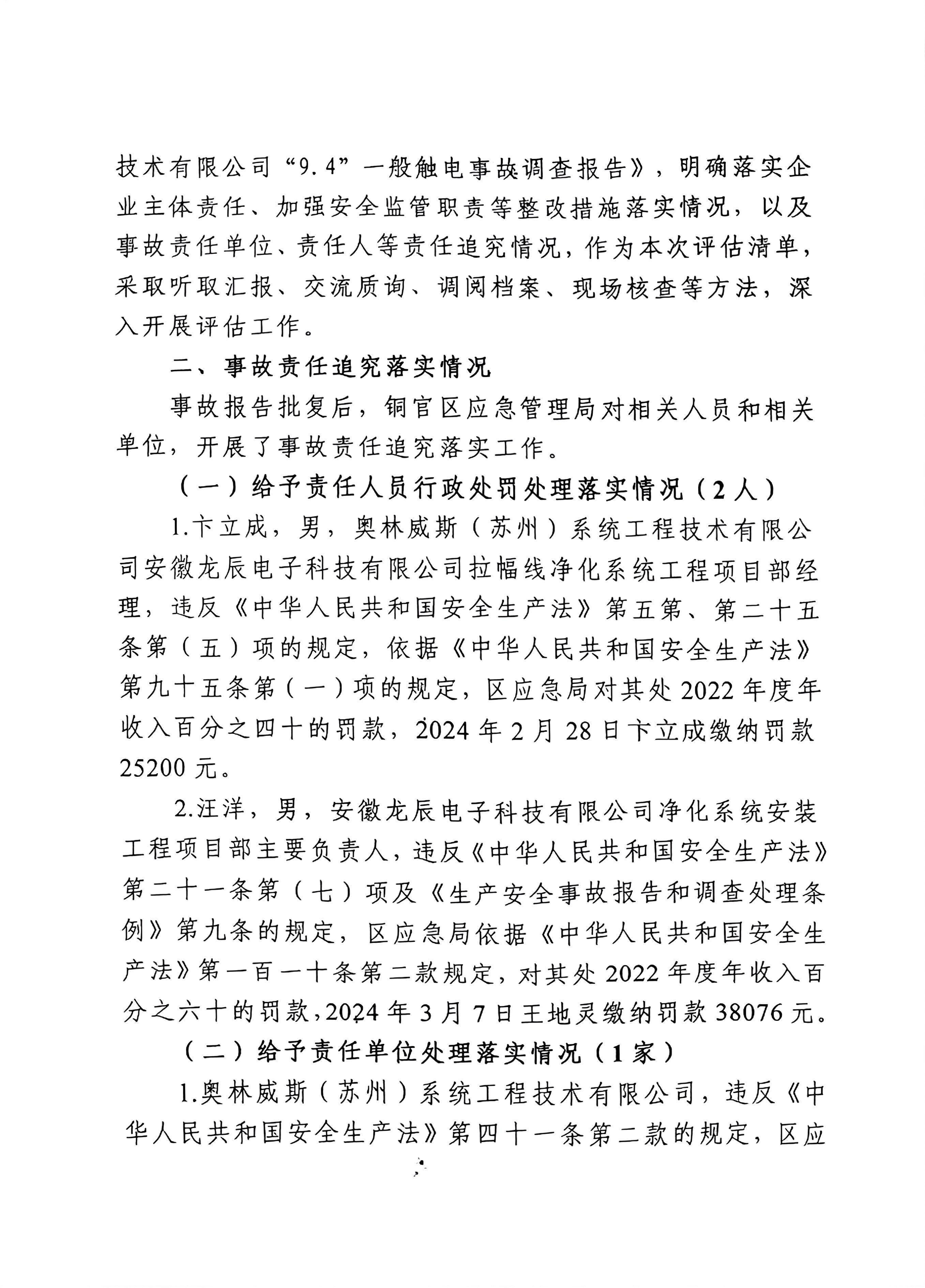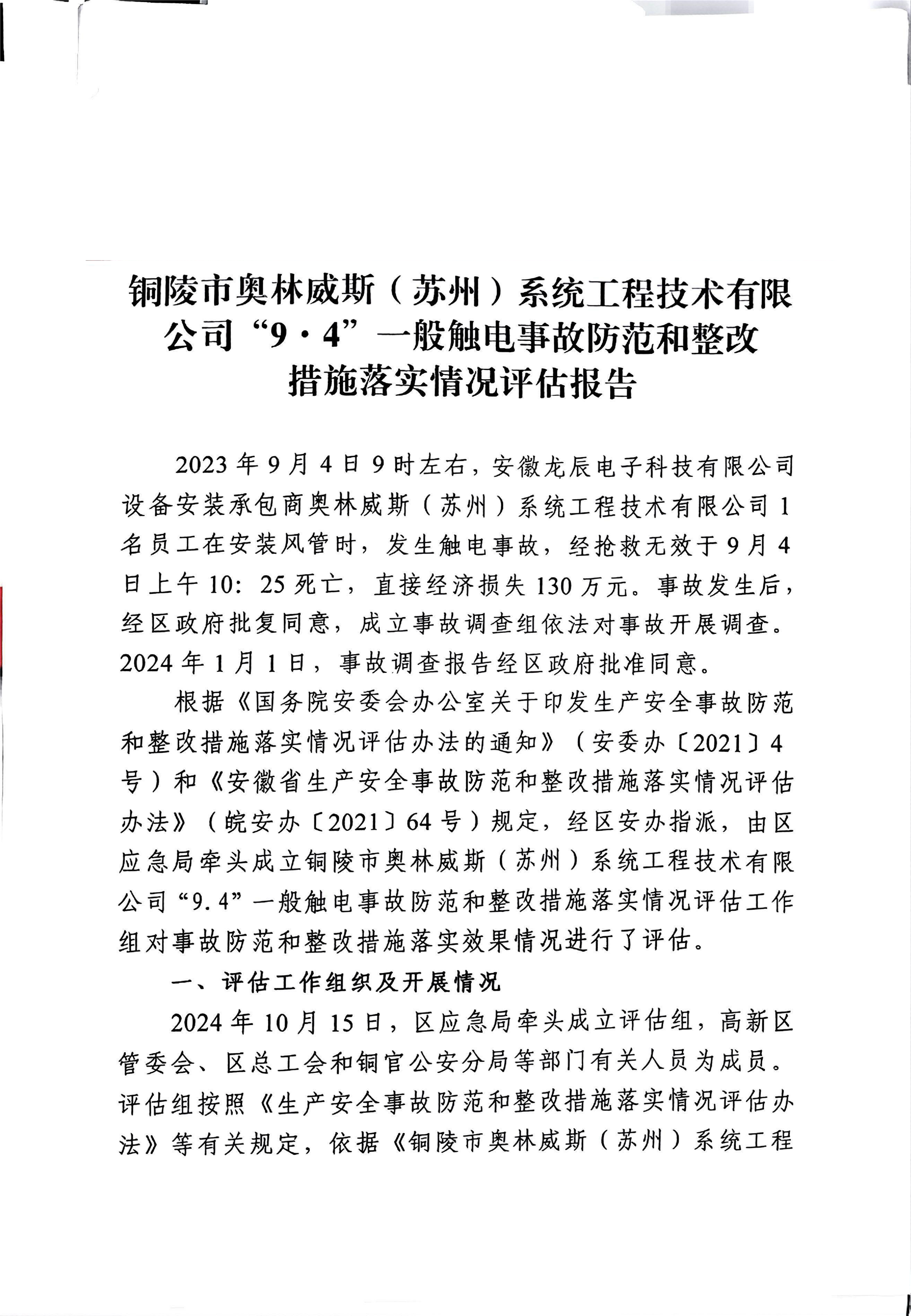 [事故处理防范措施落实情况评估情况]铜陵市奥林威斯(苏州)系统工程技术有限公司“9·4”一般触电事故防范和整改措施落实情况-铜官区人民政府