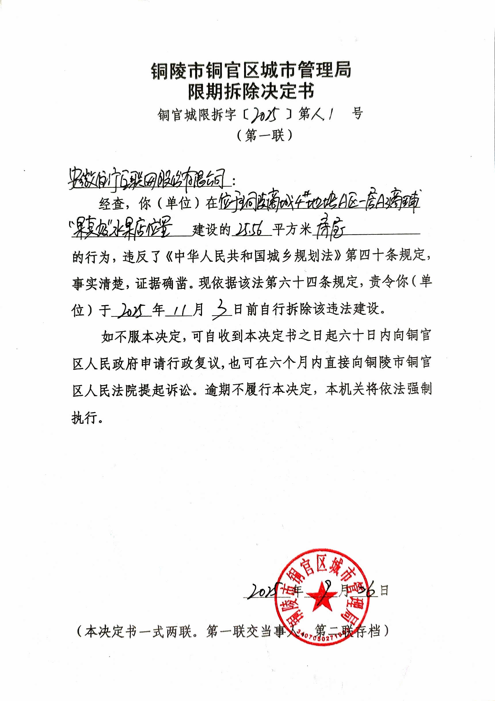 关于安徽住行互联网股份有限公司《限期拆除决定书》送达公告-铜官区人民政府