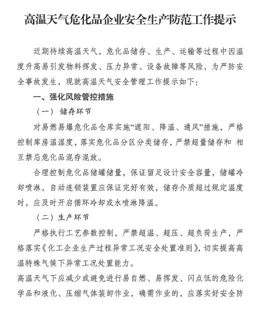 【安全生产预警提示信息】高温天气危化品企业安全生产防范工作提示-铜官区人民政府