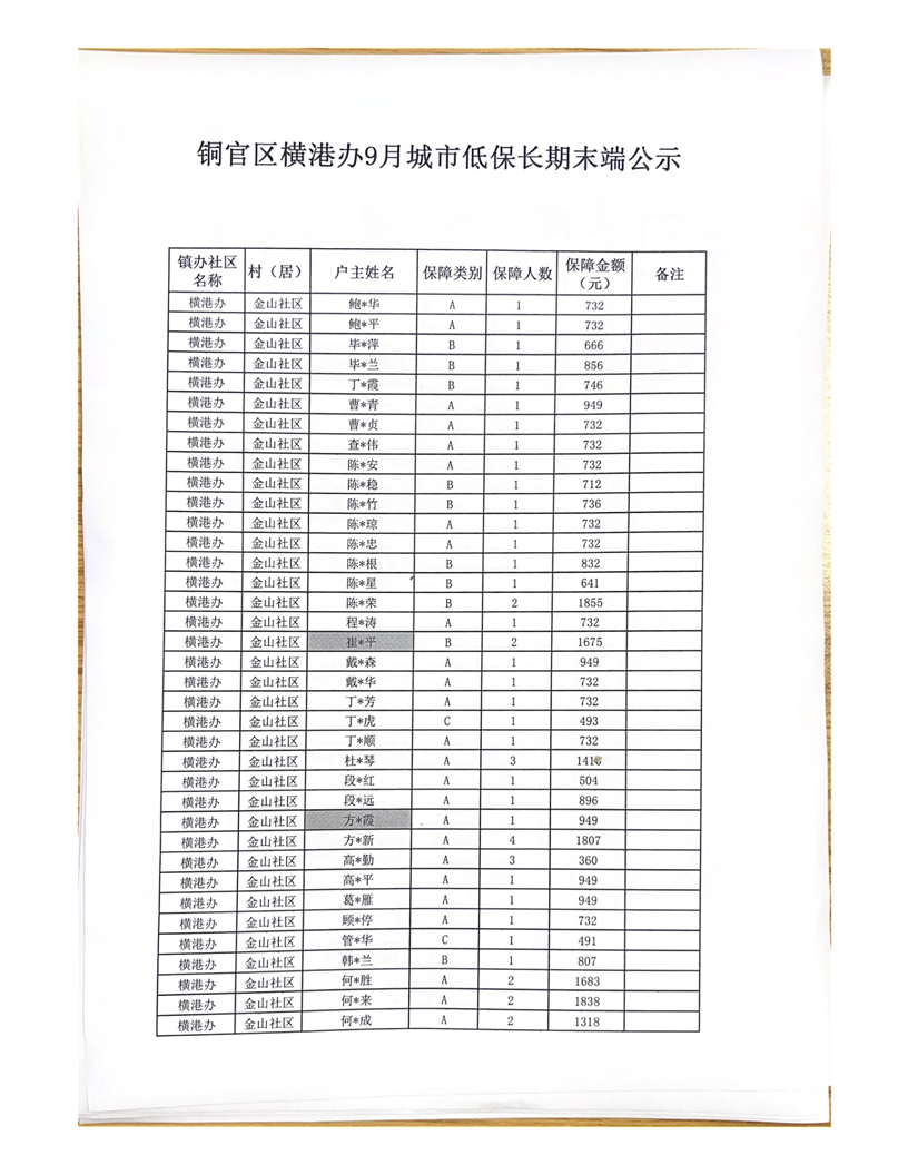 铜官区横港办9月城市低保长期末端公示-铜官区人民政府