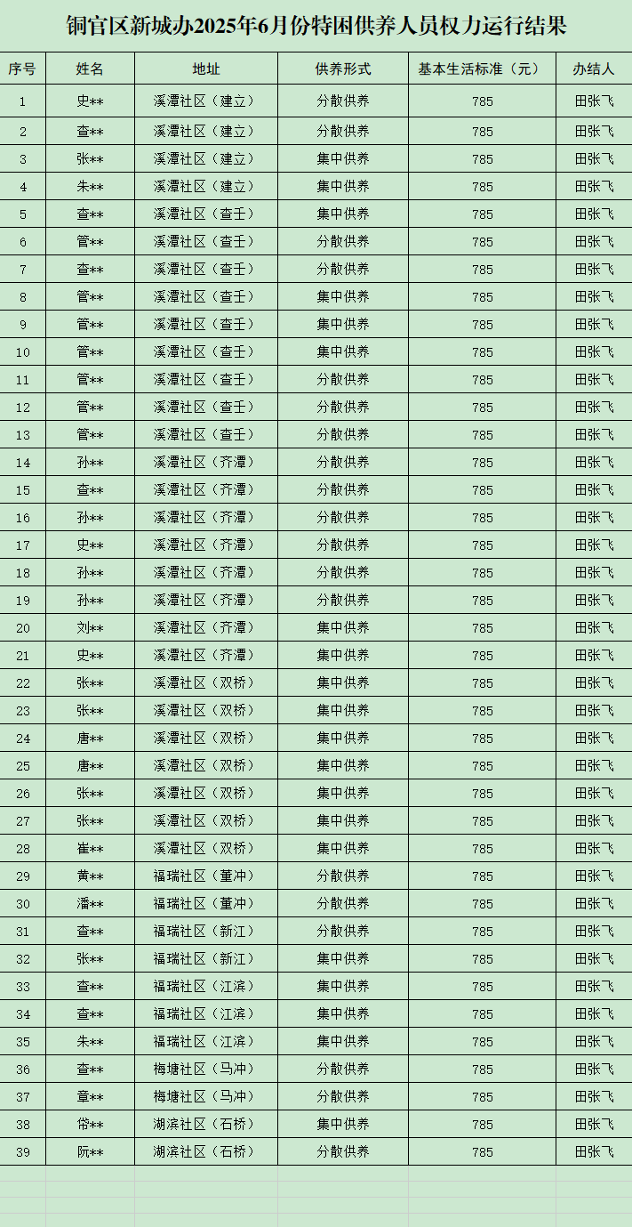 铜官区新城办2025年6月份特困供养人员权力运行结果-铜官区人民政府