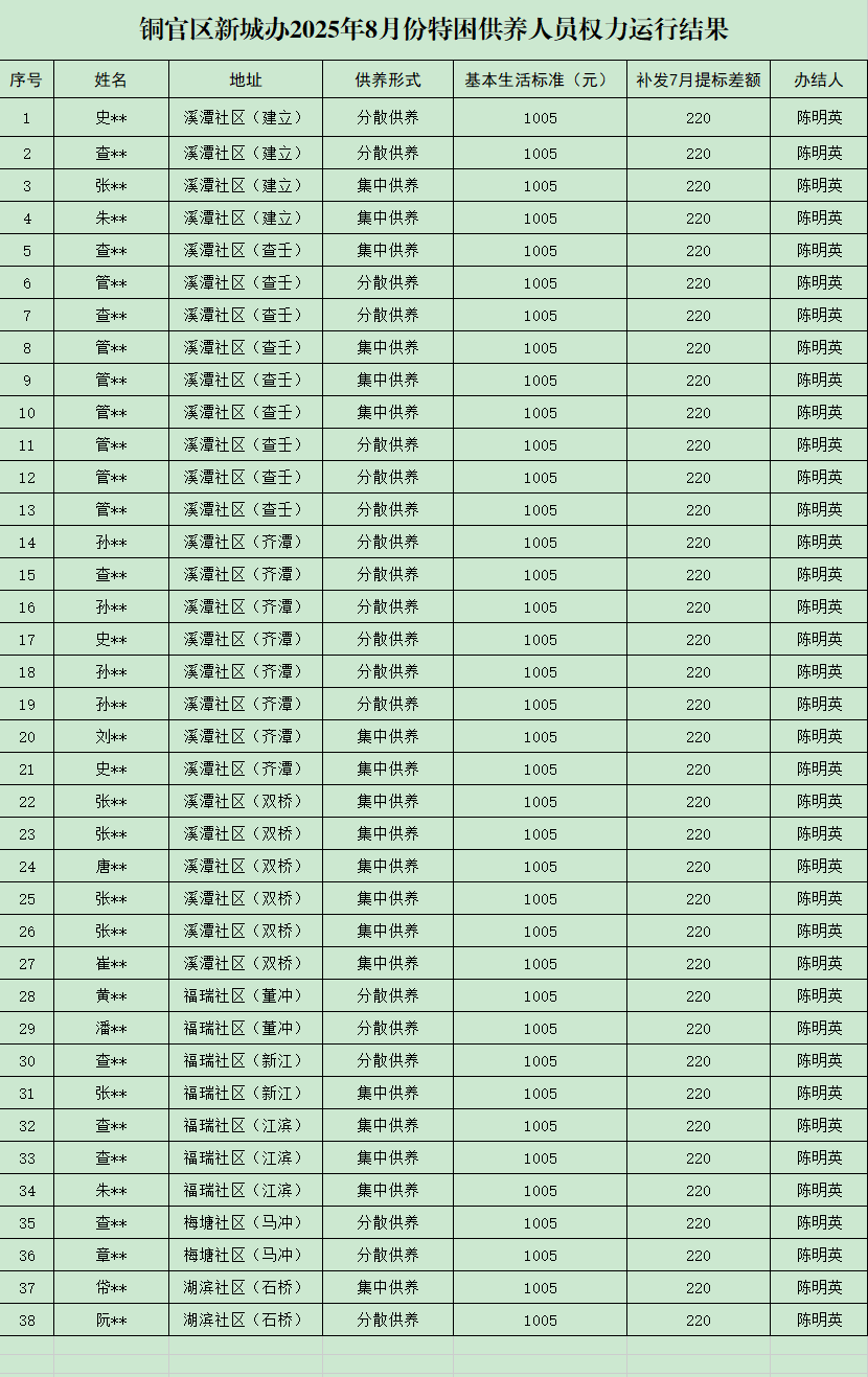 铜官区新城办2025年8月份特困供养人员权力运行结果-铜官区人民政府