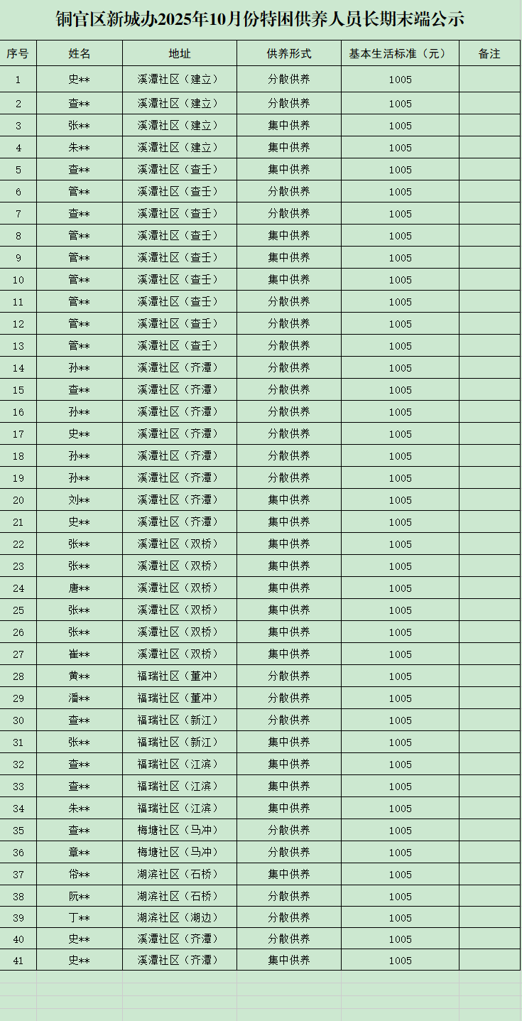 铜官区新城办2025年10月份特困供养人员长期末端公示