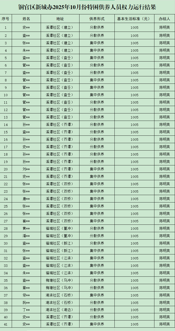 铜官区新城办2025年10月份特困供养人员权力运行结果-铜官区人民政府