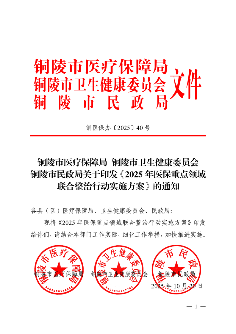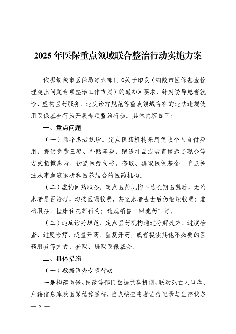 铜陵市医疗保障局 铜陵市卫生健康委员会 铜陵市民政局关于印发《2025 年医保重点领域联合整治行动实施方案》的通知-铜官区人民政府