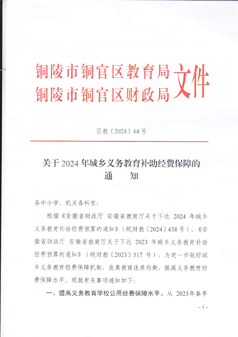 关于2024年城乡义务教育补助经费保障的通知-铜官区人民政府