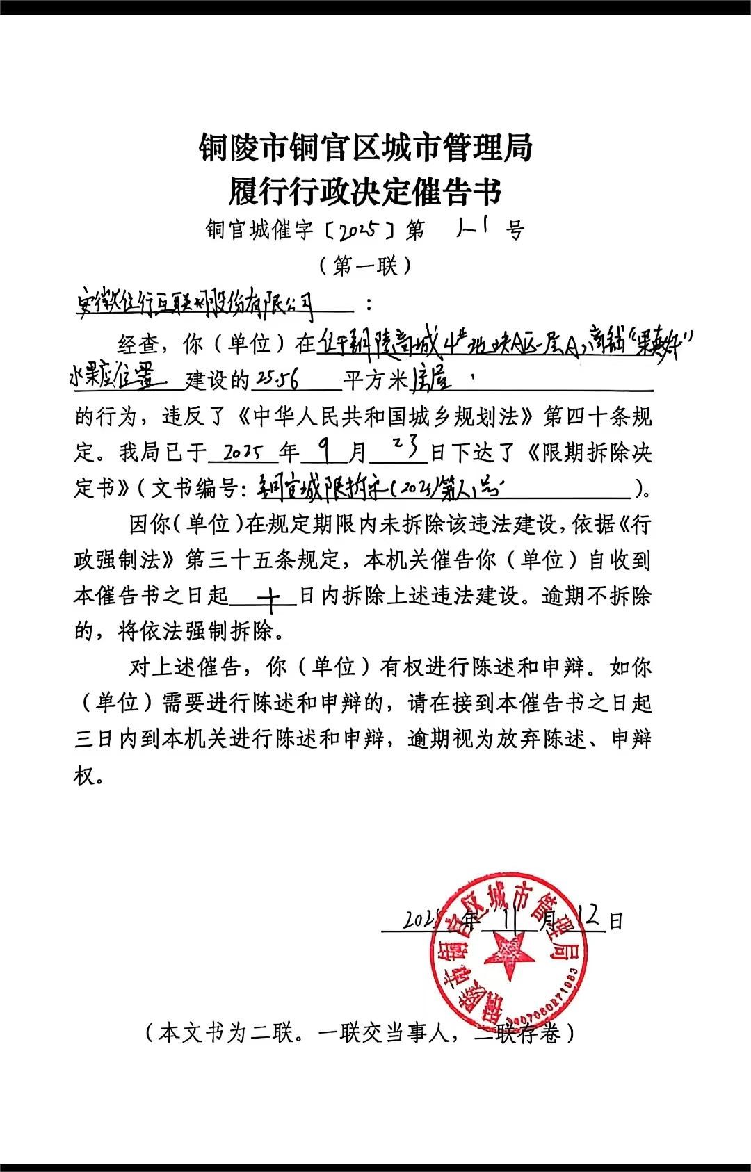 依据《中华人民共和国民事诉讼法》第九十五条,我局现就你公司在铜陵商城4#地块A区一层A3商铺“果真好”水果店位置擅自建设25.56平方米的房屋,向你公司公告送达《履行行政决定催告书》。
