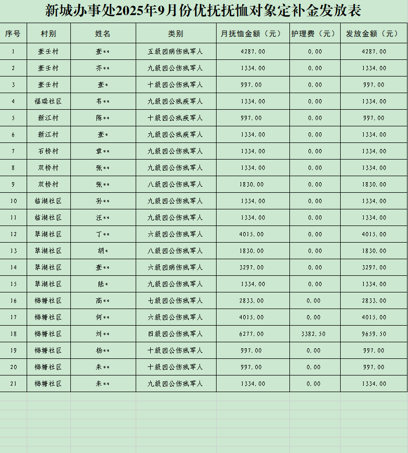 新城办事处2025年9月份优抚抚恤对象定补金发放表-铜官区人民政府