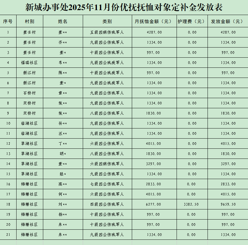新城办事处2025年11月份优抚抚恤对象定补金发放表