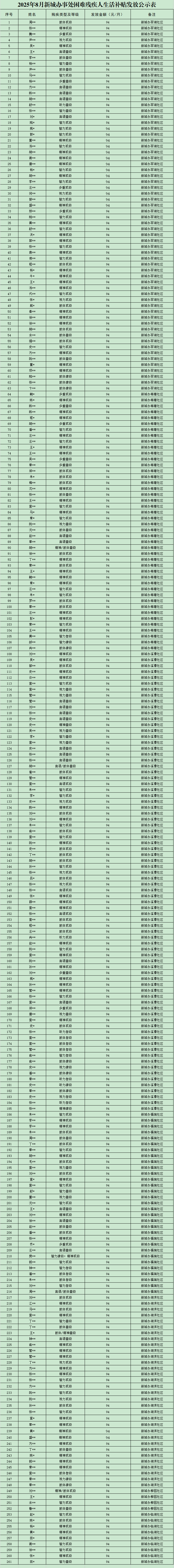 2025年8月新城办事处困难残疾人生活补贴发放公示表