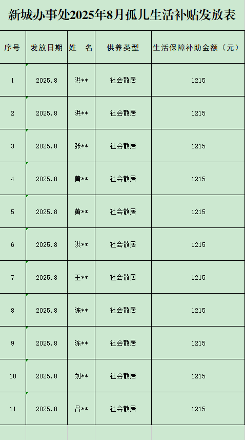 新城办事处2025年8月孤儿生活补贴发放表