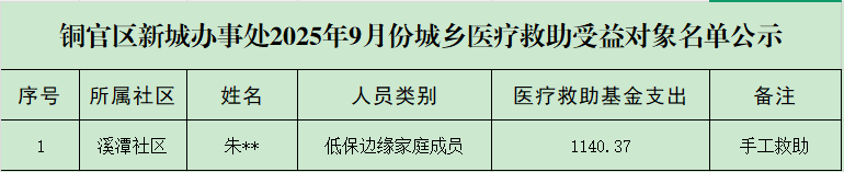 铜官区新城办事处2025年9月份城乡医疗救助受益对象名单公示(手工救助)