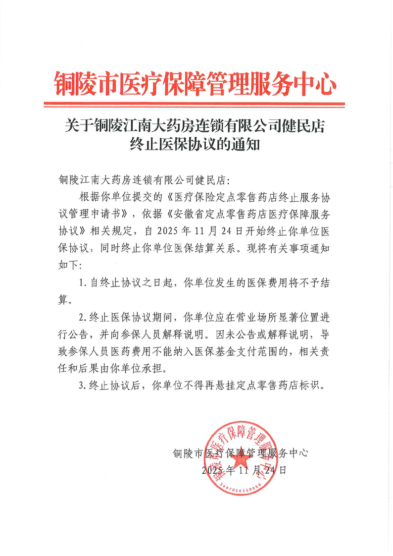 关于铜陵江南大药房连锁有限公司健民店终止医保协议的通知-铜官区人民政府