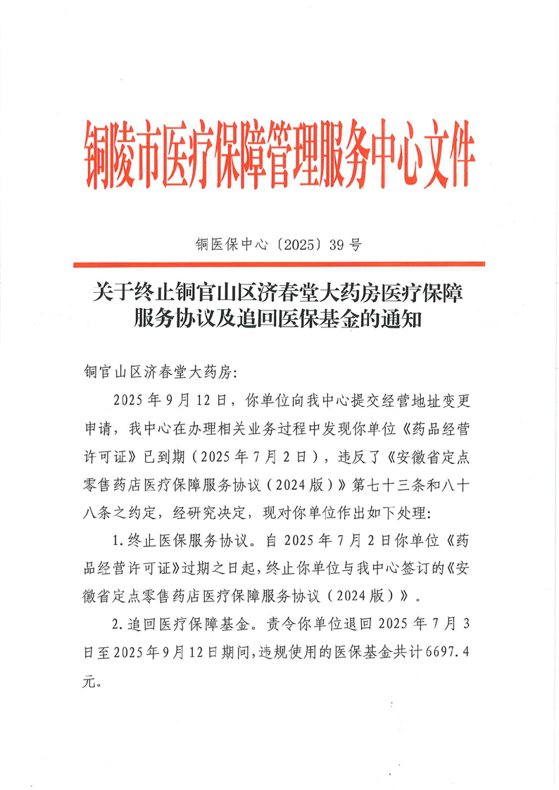 关于终止铜官山区济春堂大药房医疗保障服务协议及追回医保基金的通知-铜官区人民政府