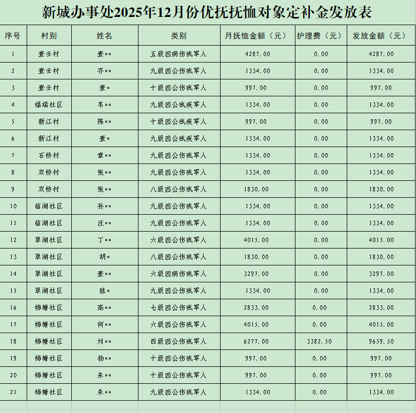 新城办事处2025年12月份优抚抚恤对象定补金发放表