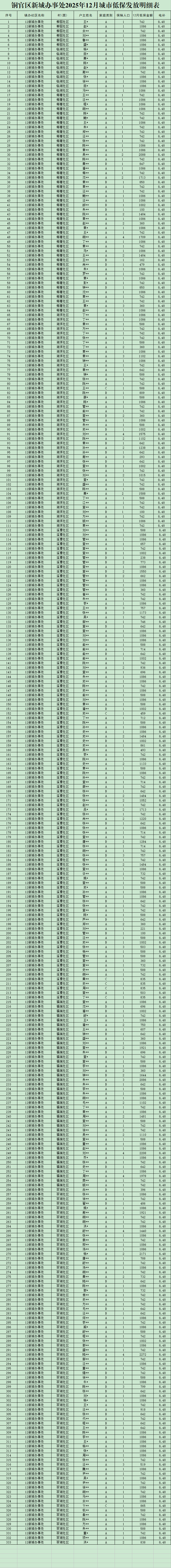 铜官区新城办事处2025年12月城市低保发放明细表-铜官区人民政府