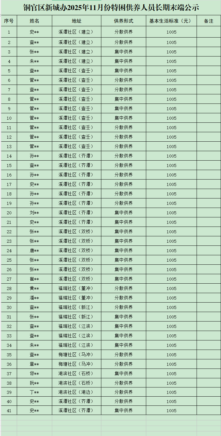 铜官区新城办2025年11月份特困供养人员长期末端公示