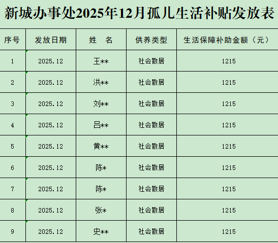 新城办事处2025年12月孤儿生活补贴发放表-铜官区人民政府