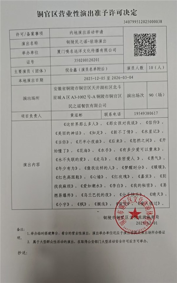 营业性演出——厦门嗅名远洋文化传播有限公司(倪金鑫)-铜官区人民政府