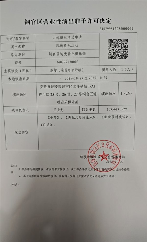 营业性演出——铜官区迪嗳音乐俱乐部(赵娜)-铜官区人民政府