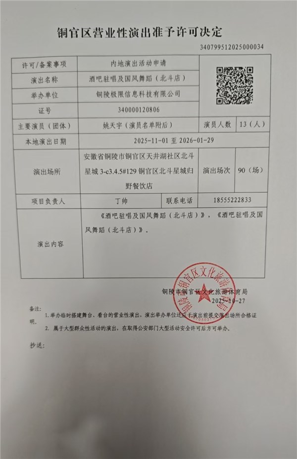 营业性演出——铜陵极限信息科技有限公司(姚天宇)-铜官区人民政府