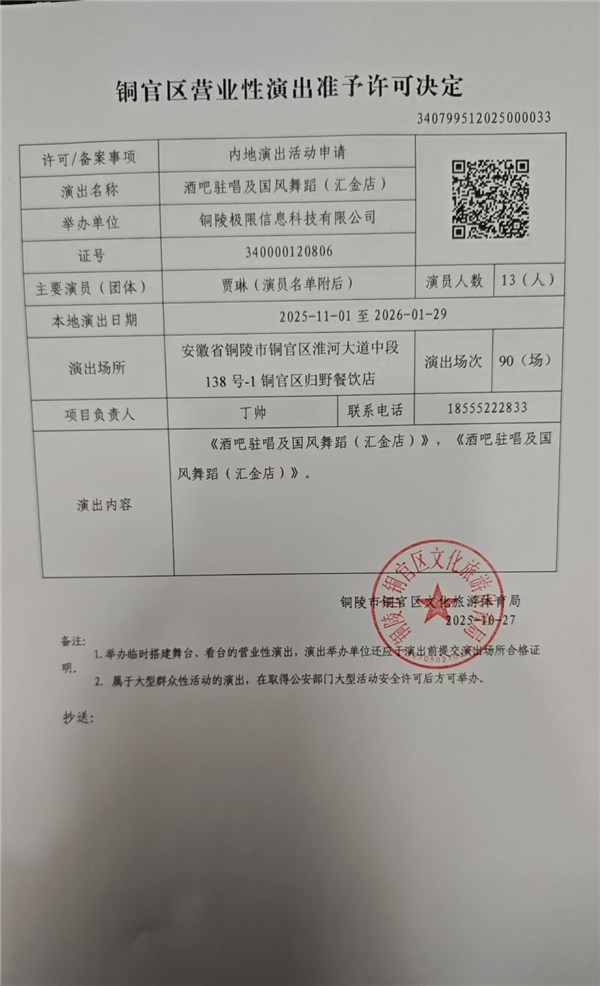 营业性演出——铜陵极限信息科技有限公司(贾琳)-铜官区人民政府