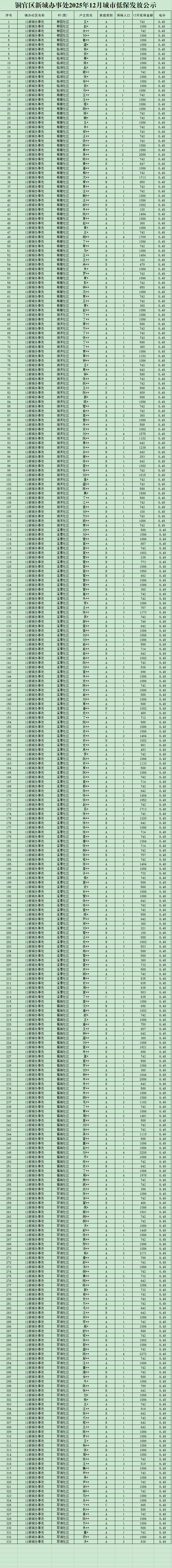 铜官区新城办事处2025年12月城市低保发放公示-铜官区人民政府