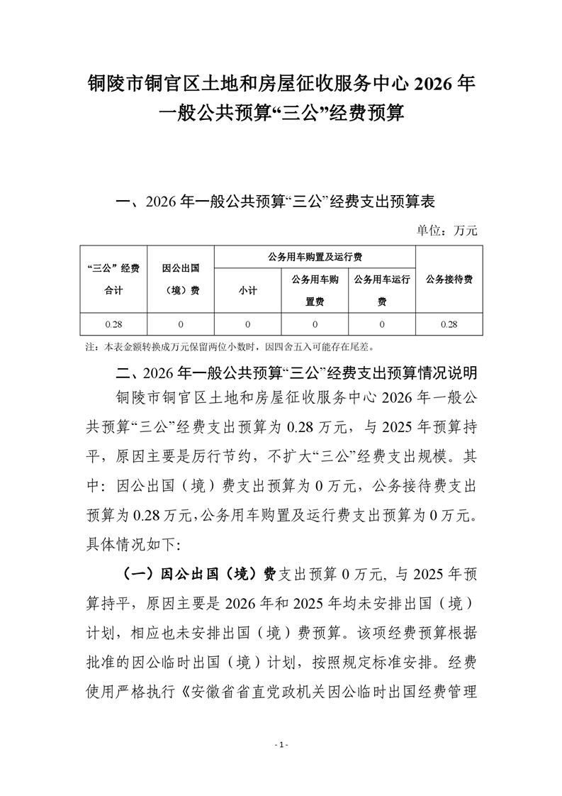 铜陵市铜官区土地和房屋征收服务中心2026年一般公共预算“三公”经费预算-铜官区人民政府