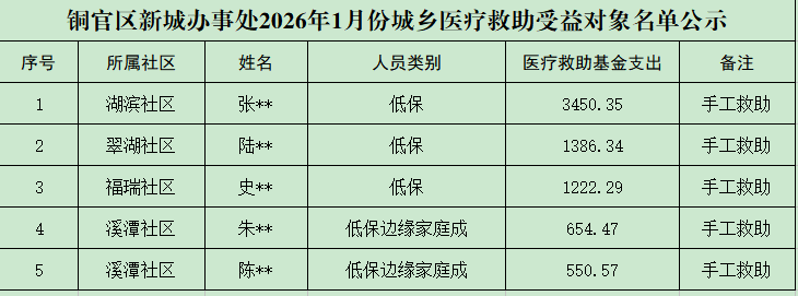 铜官区新城办事处2026年1月份城乡医疗救助受益对象名单公示