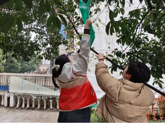 今天路面湿滑,街巷里行人稀少,但小左的巡查却一丝不苟。她沿着熟悉的路线仔细查看,不放过任何一处可能影响居民安全的细节。行至社区内的海棠树下,她敏锐地发现高高的树杈上悬挂着一大块被风吹上去的塑料板,在大风中摇摇欲坠,对过往行人构成不小的安全隐患。小左立即联系同事,两人合力,借助工具小心地将塑料板取下,及时排除了这颗“头顶上的地雷”。