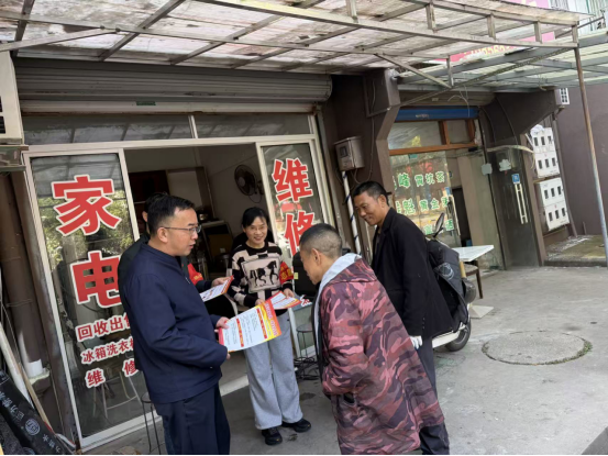 图为工作人员与下沉党员志愿者在沿街商铺宣传