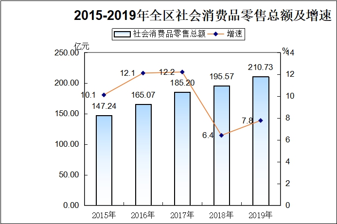 2019年,全区累计实现社会消费零售总额2107310万元,同比增长7.8%。其中,限额以上消费品零售额累计完成389190万元,同比下降9.1 %;限额以下零售额累计完成1718120万元,同比增长12.5%。