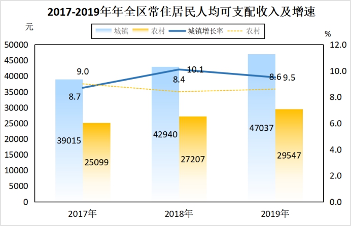2019年,全区常住居民人均可支配收入47003元,同比增长9.5%。其中,城镇居民人均可支配收入47037元,同比增长9.5%;农村居民人均可支配收入29547元,同比增长8.6 %。