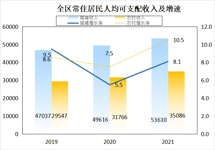 2021年,全区常住居民人均可支配收入53579元,同比增长8.1%,其中城镇居民人均可支配收入53610元,同比增长8.1%,农村人均可支配收入35086元,同比增长10.5%。