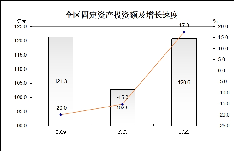 2021年,全区实现全部一般预算收入13.1亿元,同比增长11.3%。全区财政支出21.0亿元,同比增长3.0%。