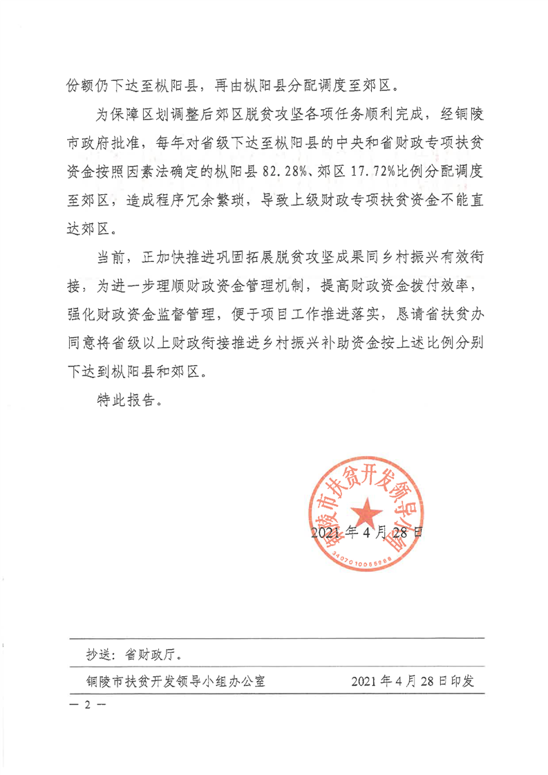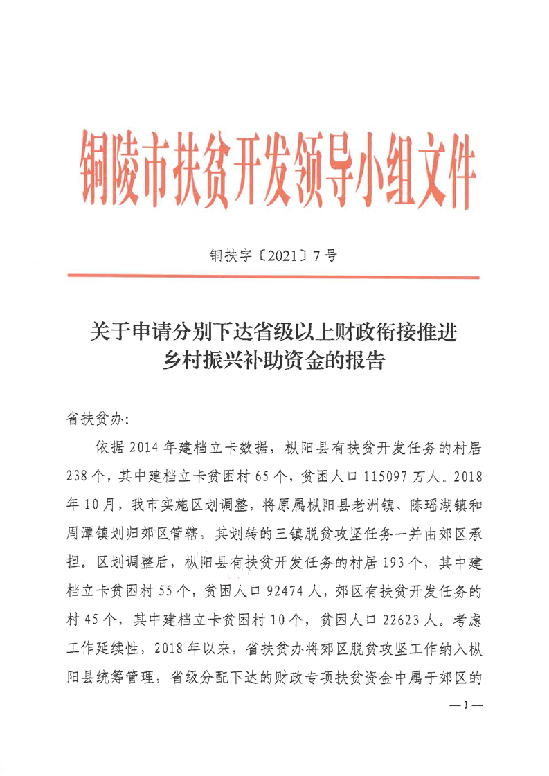 《关于申请分别下达省级以上财政衔接推进乡村振兴补助资金的报告》-铜官区人民政府