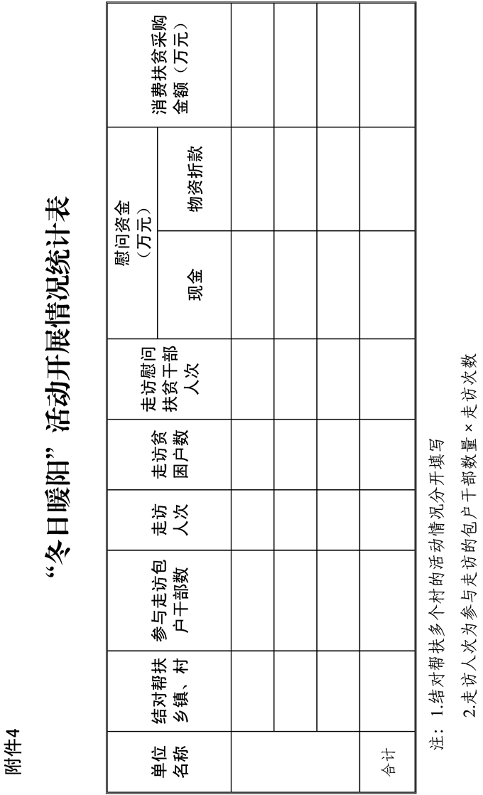(四)认真总结经验,及时报送材料。各单位要对活动情况及时进行分析总结,2月28日前填写《“冬日暖阳”活动开展情况统计表》(附件4)报送市扶贫开发局(联系电话:5886069;邮箱:tlsfpjdck@126.com),枞阳县、郊区负责统计本级包村单位活动开展情况及结对帮扶计划。