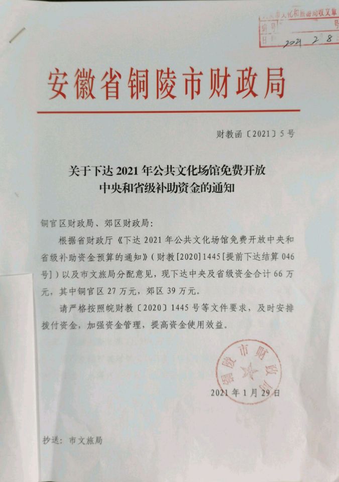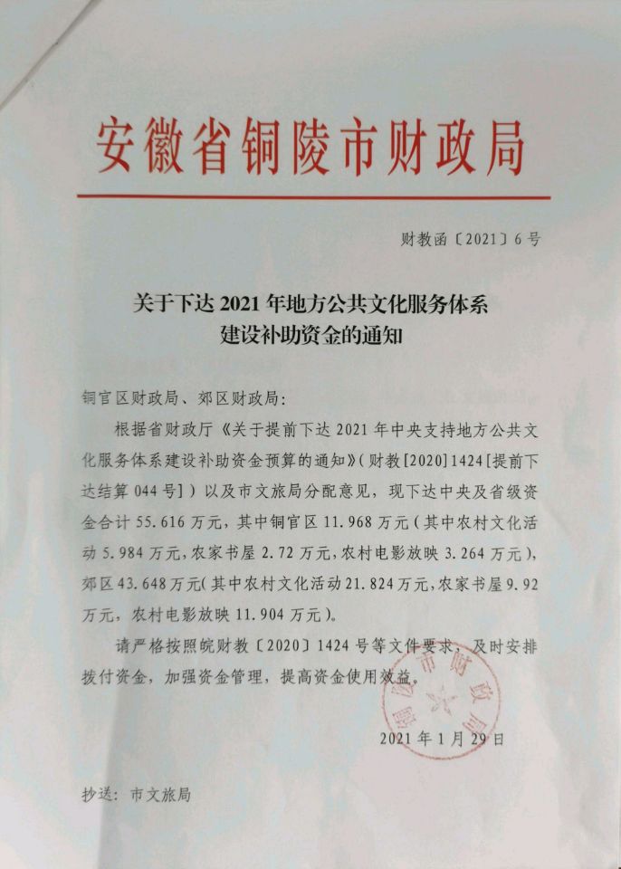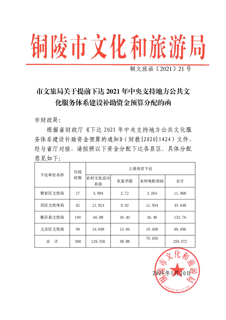 5、《市文旅局关于提前下达2021年中央支持地方公共文化服务体系建设补助资金预算分配的函》 (铜文旅函〔2021〕21号)