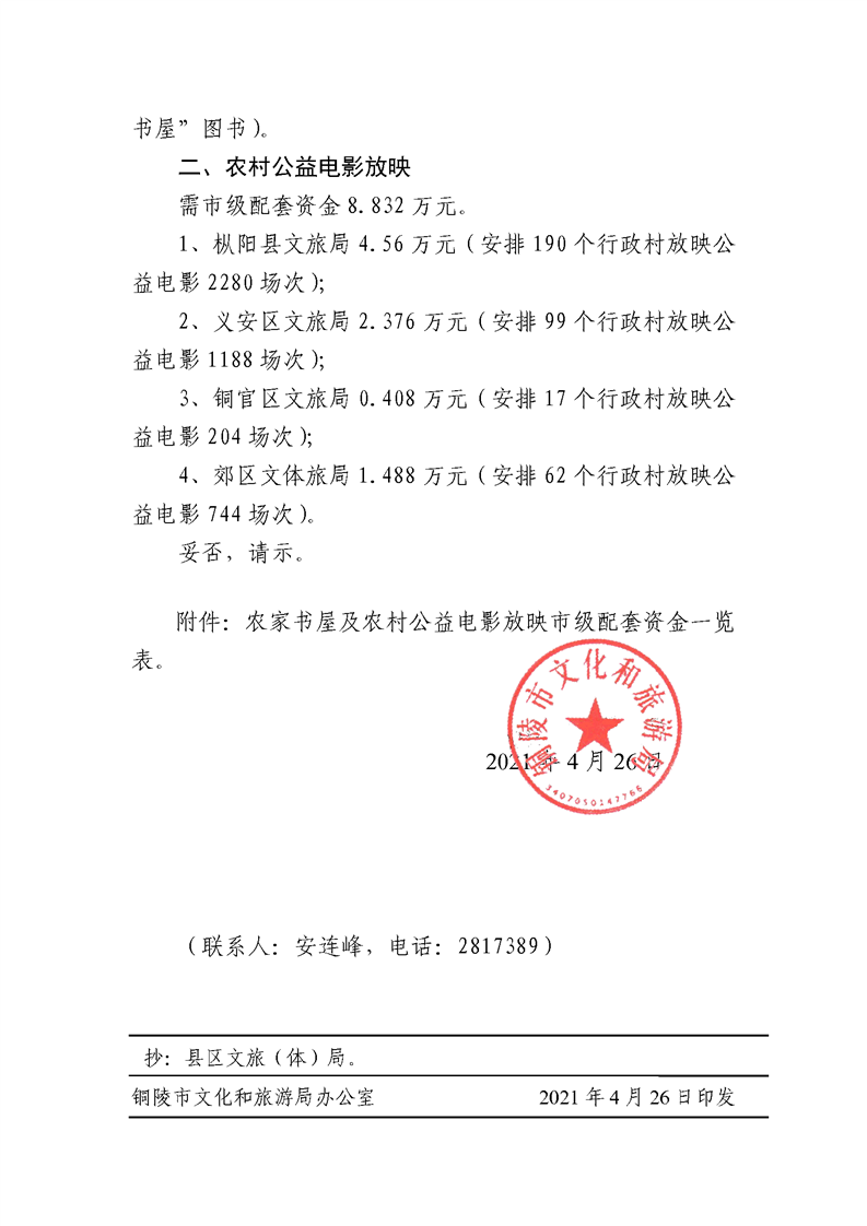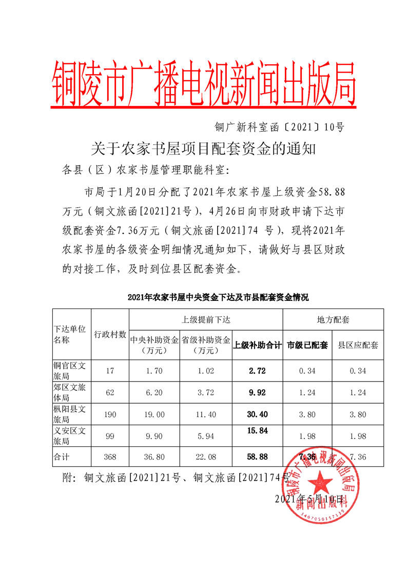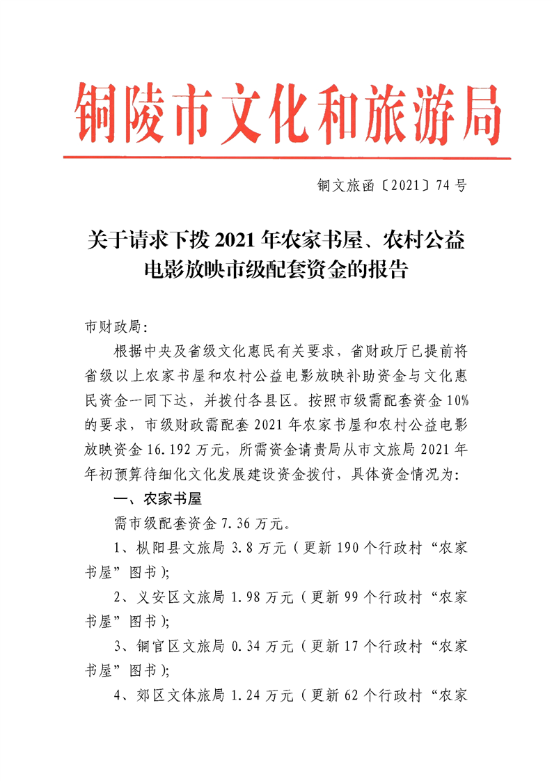 二、根据铜广新科室函〔2021〕10号、铜文旅函〔2021〕21号和铜文旅函〔2021〕74号文件农家书屋、农村公益电影放映央省级配套资金市级配套资金、和区级配套资金分配如下: