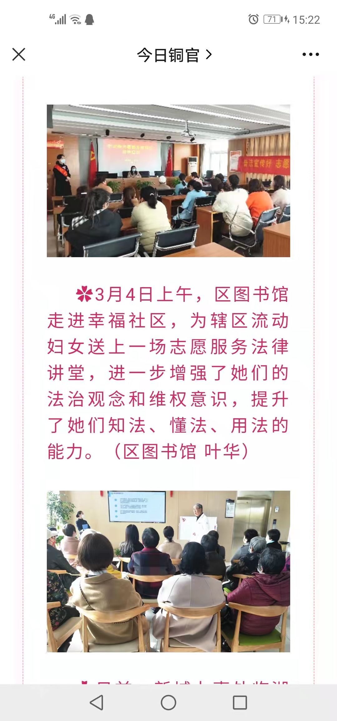 区图书馆走进社区为辖区流动妇女带去法律讲堂-铜官区人民政府