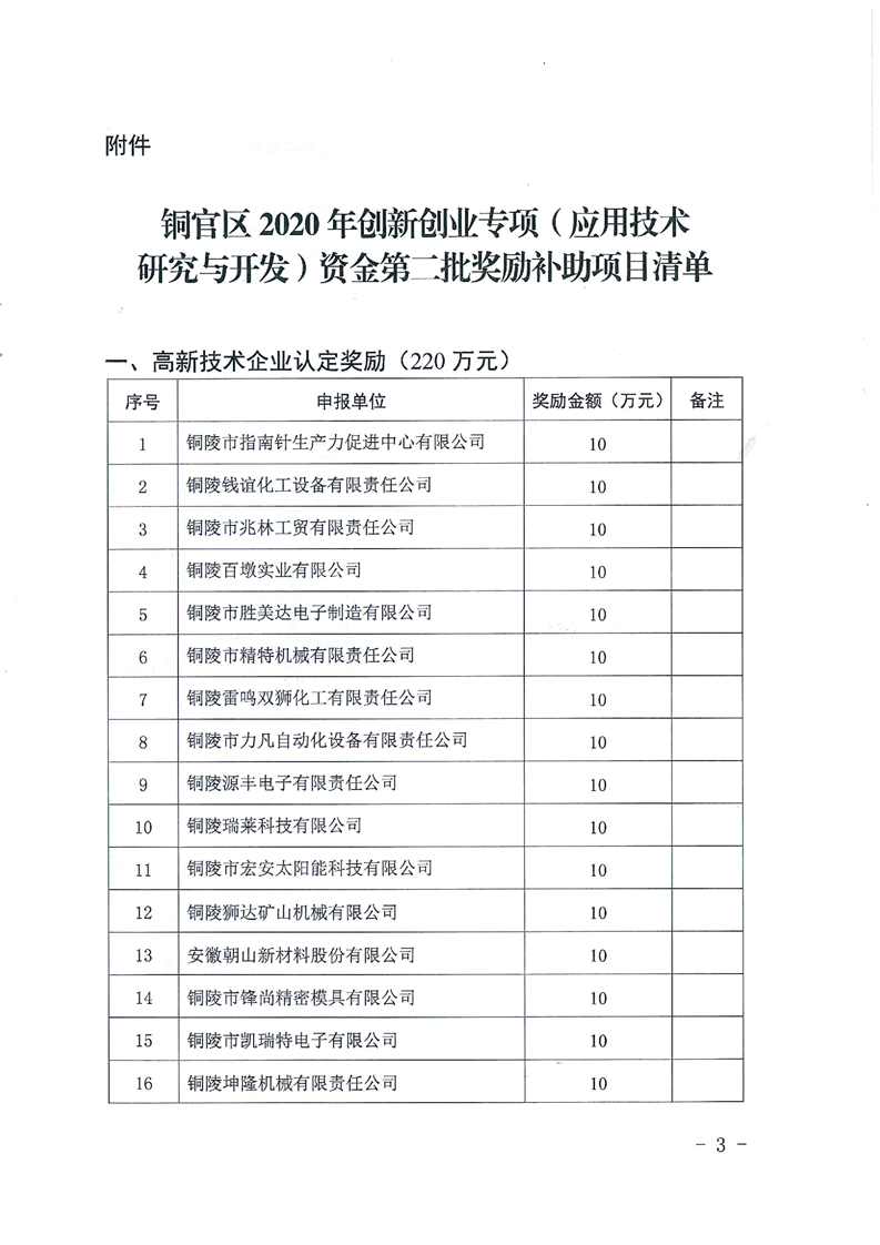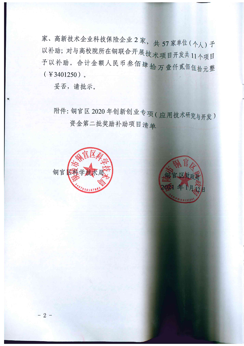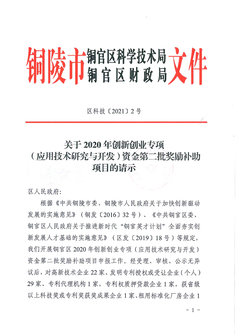 铜官区2020年创新创业专项(应用技术研究与开发)资金第二批拟奖励补助项目下达-铜官区人民政府