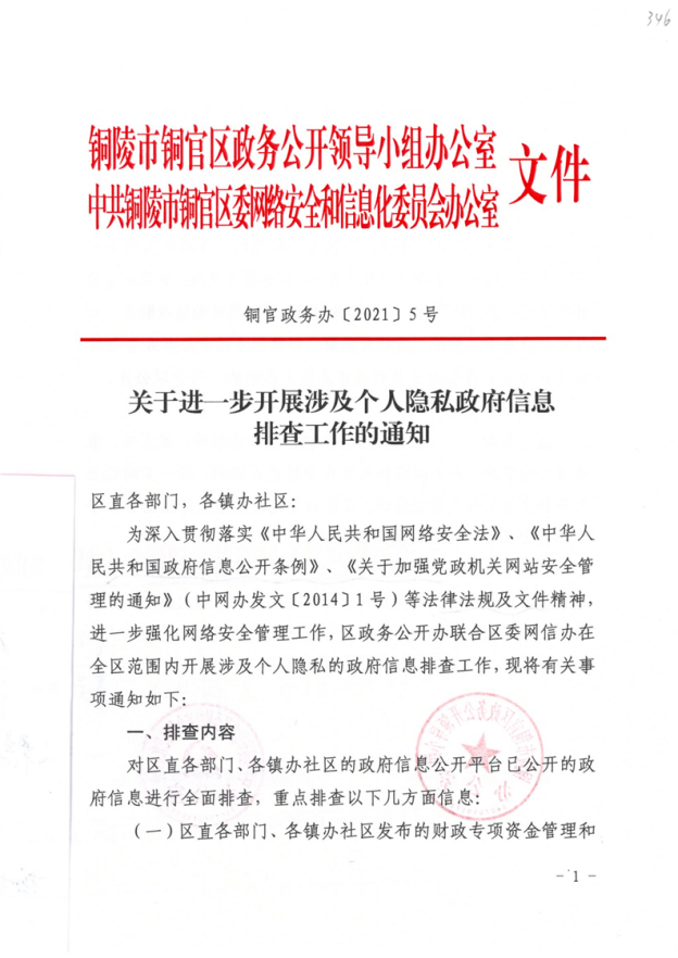关于进一步开展涉及个人隐私政府信息排查工作的通知-铜官区人民政府