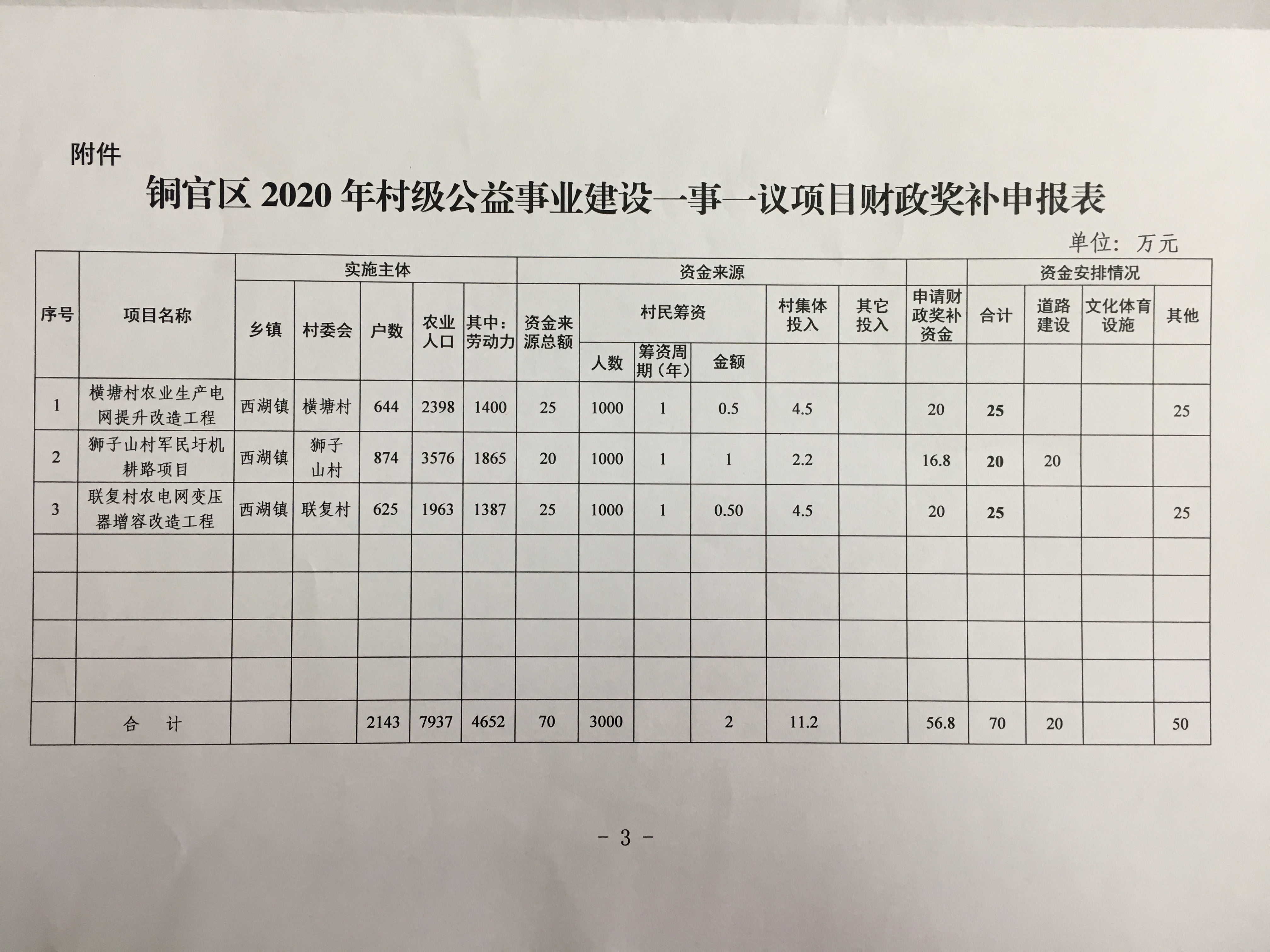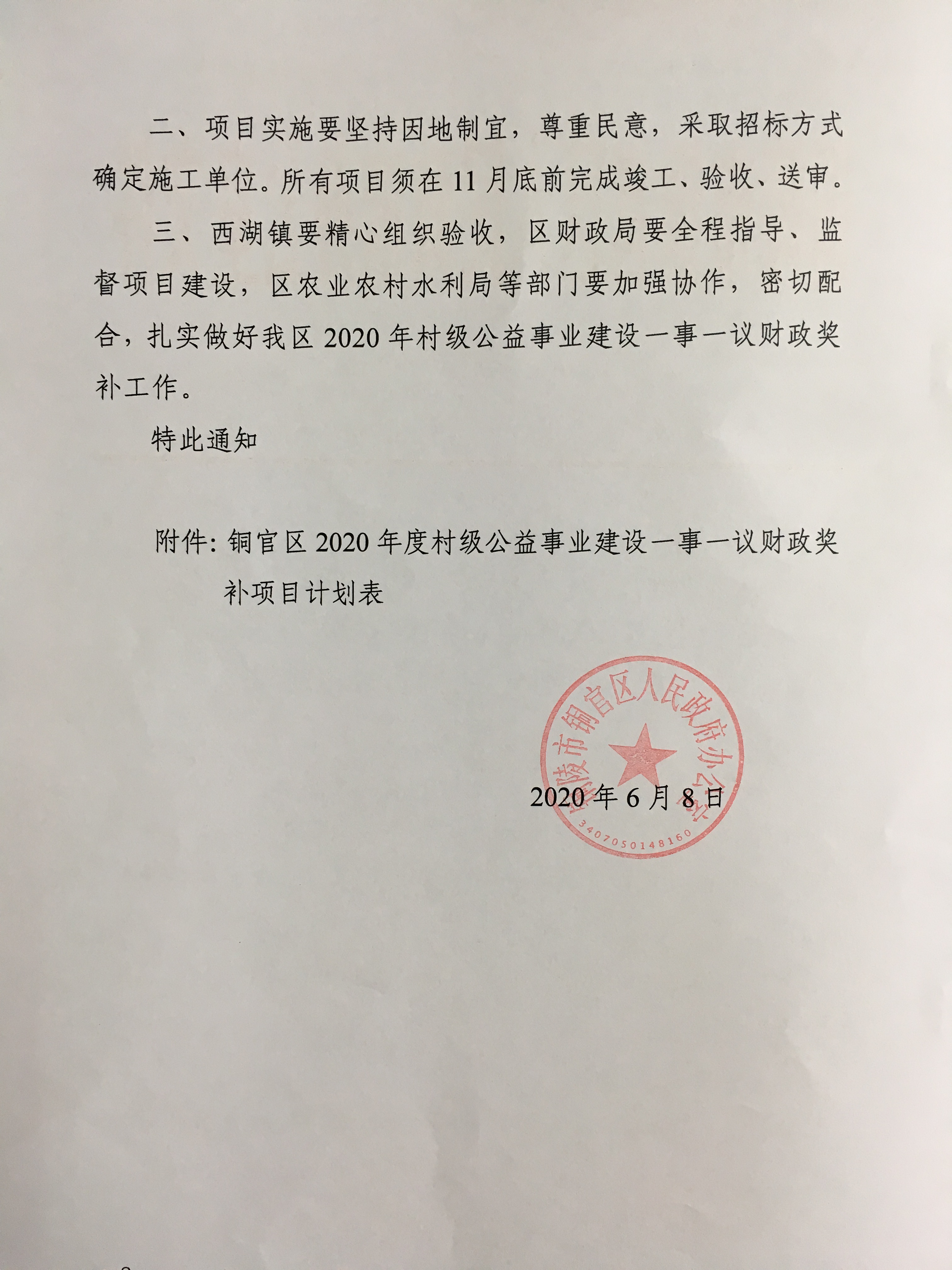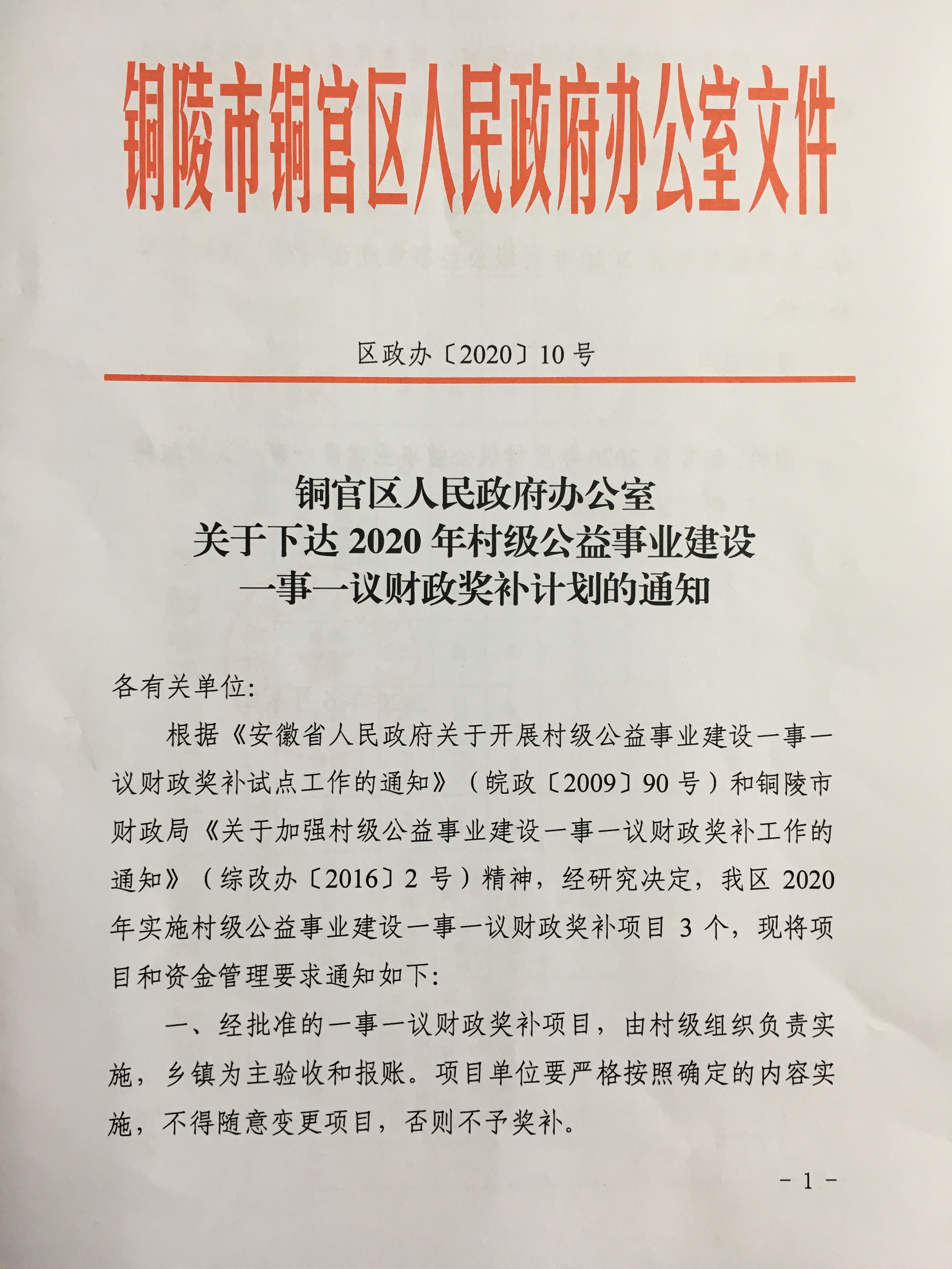 关于下达2020年村级公益事业建设一事一议财政奖补计划的通知-铜官区人民政府