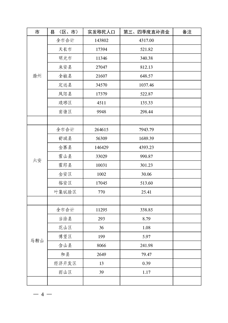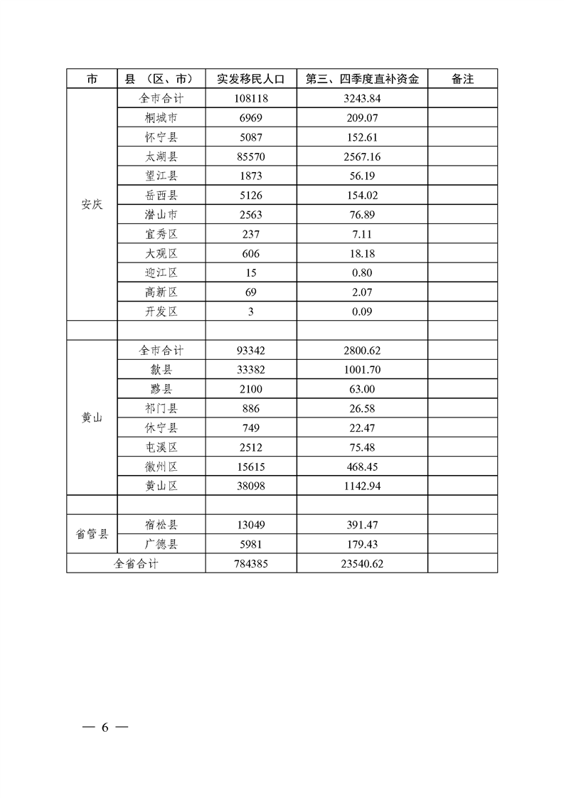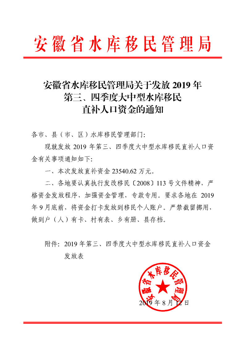 安徽省水库移民管理局关于发放 2019 年 第三、四季度大中型水库移民直补人口资金的通知