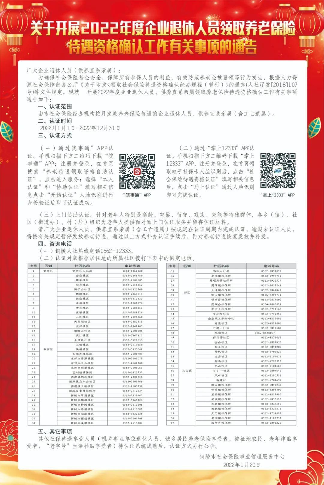 关于开展2022年度企业退休人员领取养老保险待遇资格确认工作有关事项的通告-铜官区人民政府