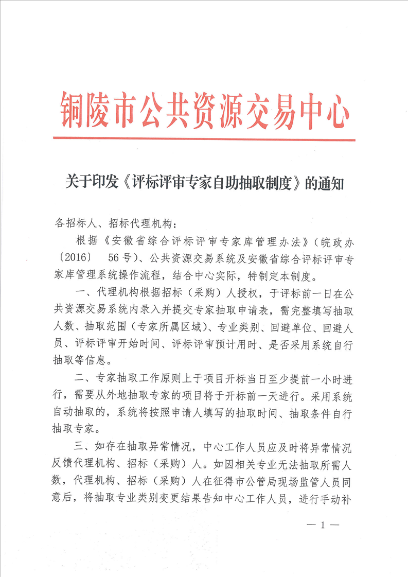 关于印发《评标评审专家自助抽取制度》的通知-铜官区人民政府