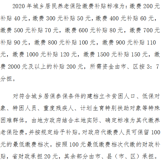 2020年城乡居民养老保险缴费补贴标准 |