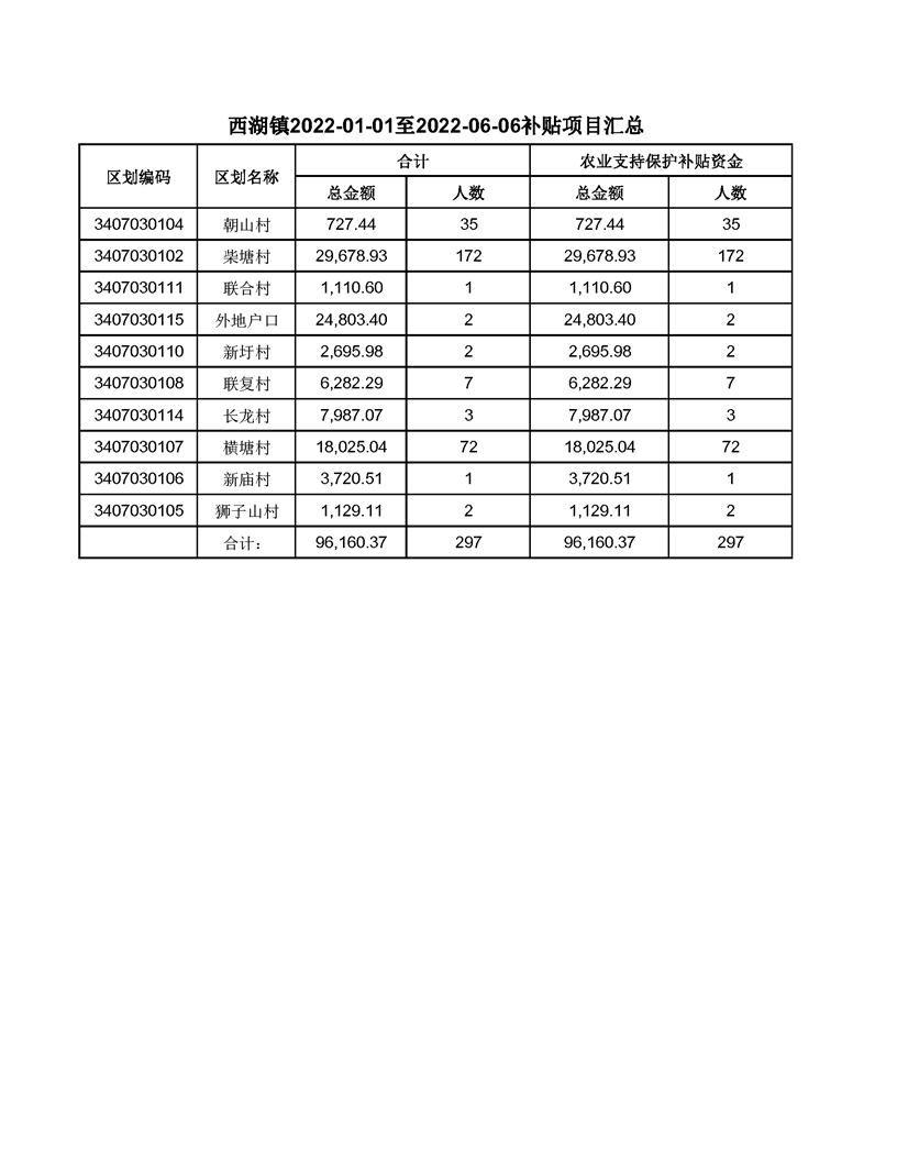 西湖镇2022年1-6月农业支持保护补贴资金汇总信息表-铜官区人民政府