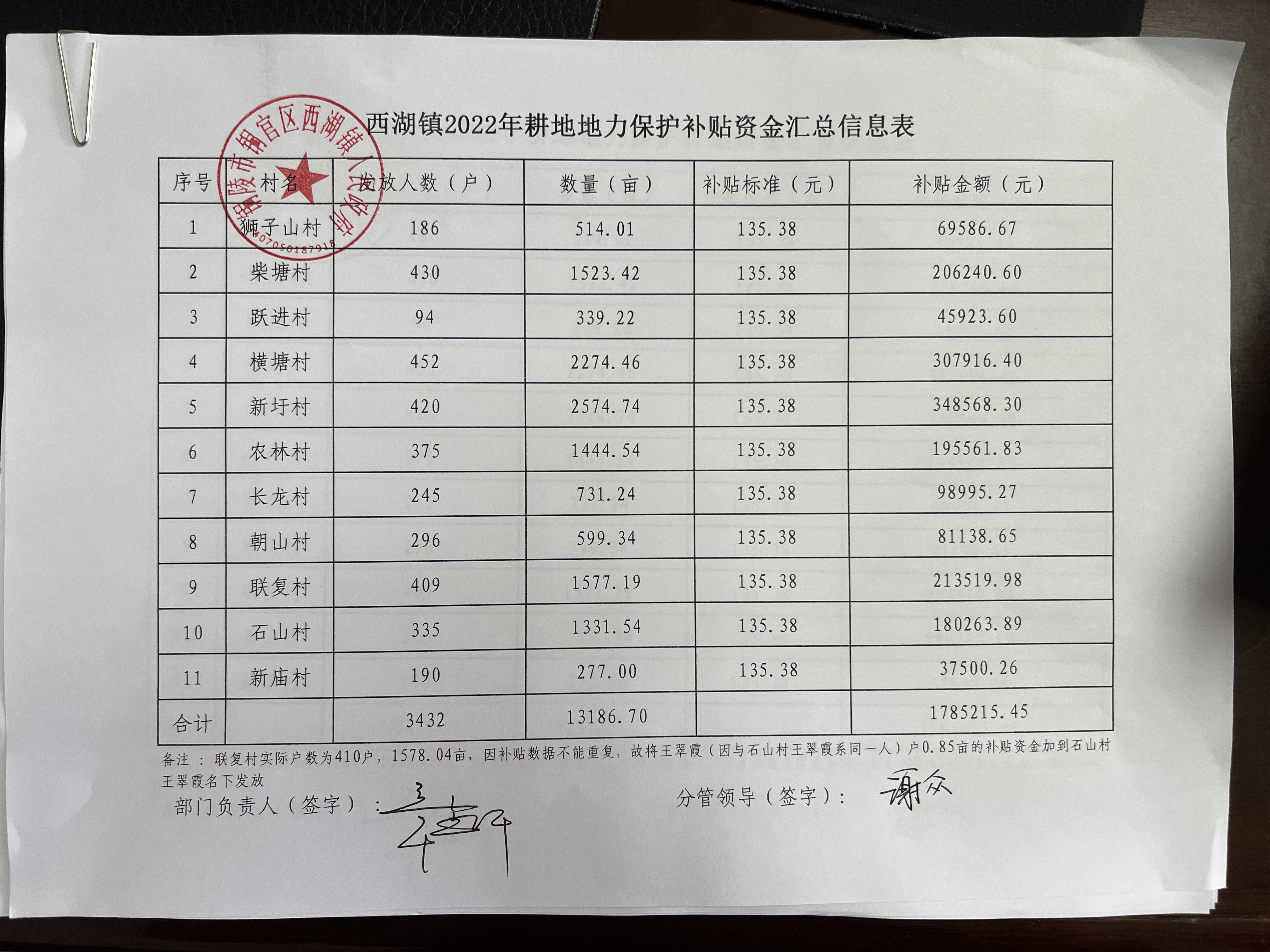 西湖镇2022年耕地地力保护补贴资金汇总信息表