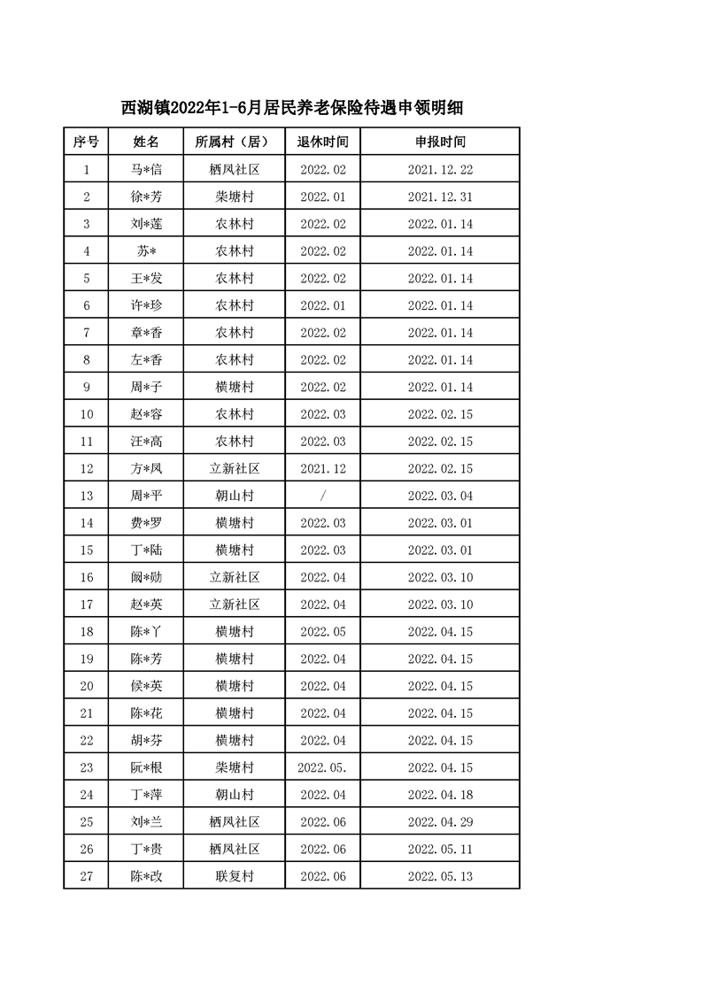 西湖镇2022年1-6月城乡居民养老保险待遇申领明细